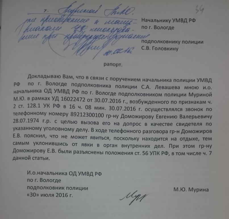 Вот, например, подполковник полиции Майя Мурина, в рапорте она пишет, что сообщила мне о возбуждении уголовного дела, вызывала на допрос и уведомила о части 7 статье 56 УПК.
