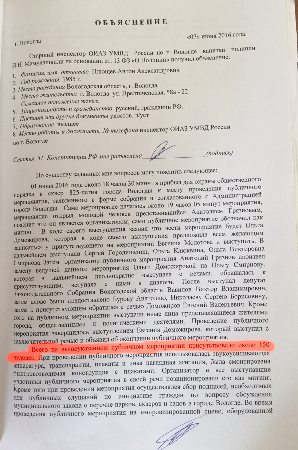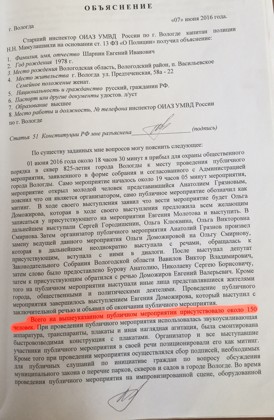 Ни как не могу понять, кто тут идиот, подполковник Головкин? Или инспектор Мамулашвили и дознаватель Горанский вместе с судьей Ширяевой? Но, ведь подполковник Головкин внимательно смотрел в поступившие ему из Администрации города документы и четко знал, еще 31 мая, что организатор собрания движение «Вместе», что разрешенная численность 1000 человек, что уполномоченное лицо Анатолий Грязнов. Почему же этого не видят его подчиненные? Скорее всего, подполковник Головкин находился в здравом уме и твёрдой памяти, а они нет?