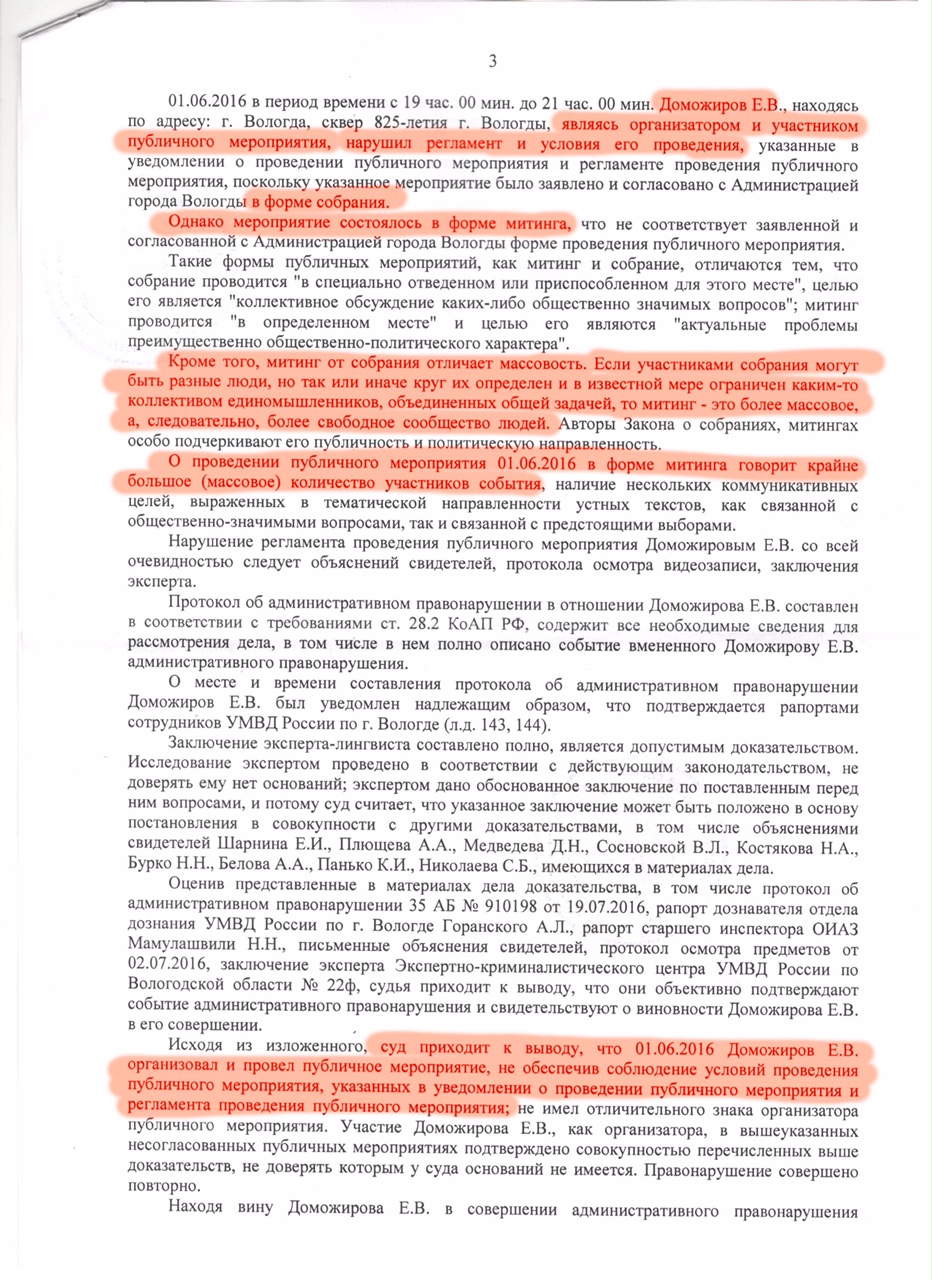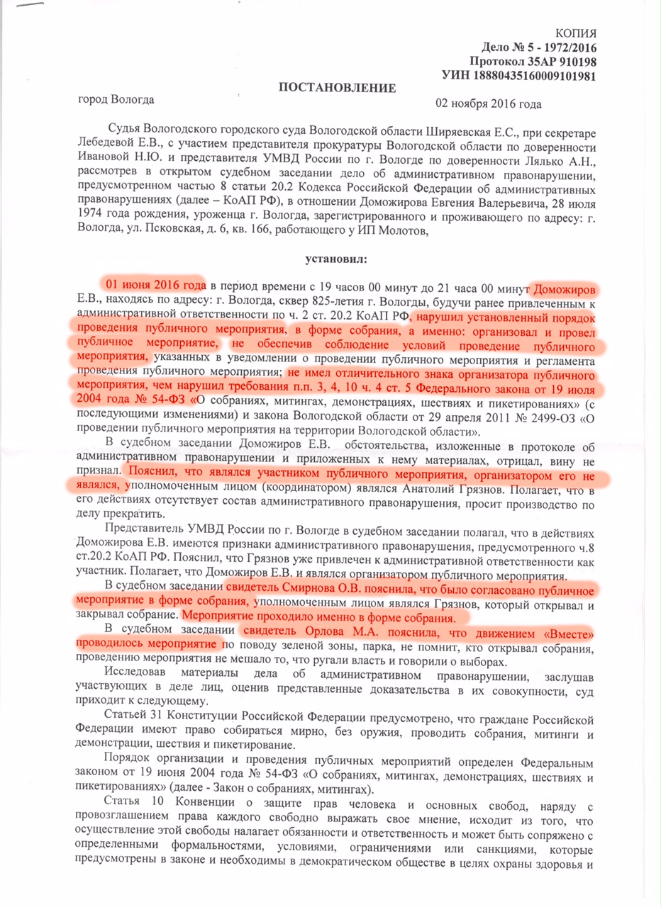 За массовость проведенного публичного мероприятия или за то, что организатором являлось движение «Вместе», а не Евгений Доможиров?