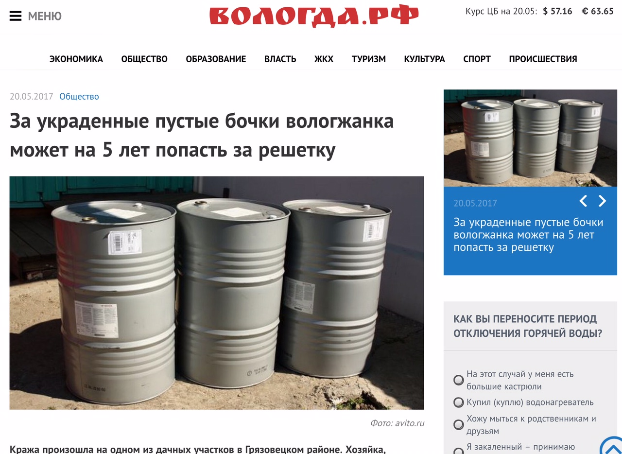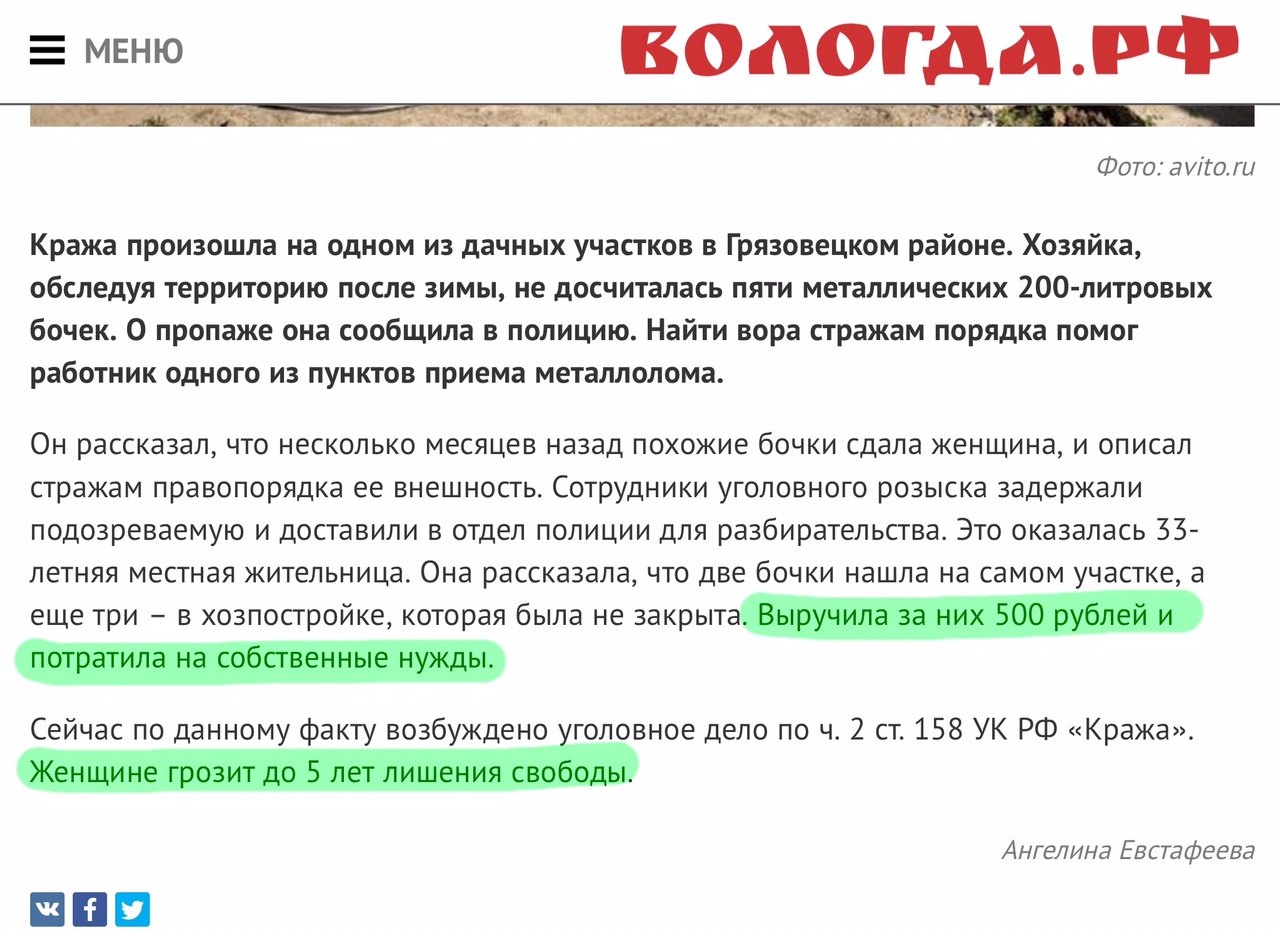 Вот, посмотрите, прямо короли заголовка публиковали эту новость — За украденные пустые бочки вологжанка может на 5 лет попасть за решетку