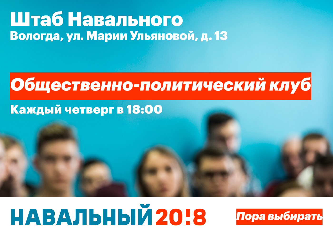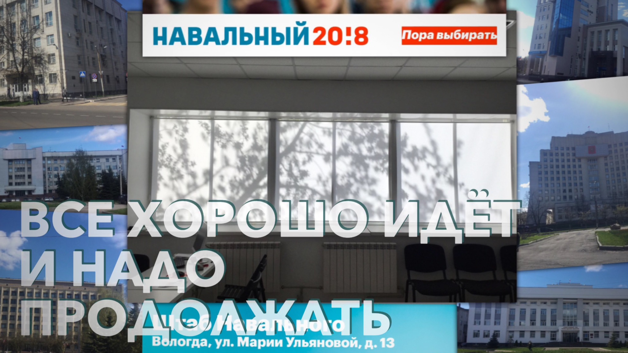 «23 апреля в Вологде по адресу Марии Ульяновой 13 был открыт штаб кандидата в Президенты РФ Алексея Навального. Он расположен на одной из центральных площадей города вблизи зданий Правительства области, Законодательного Собрания Вологодской области, Вологодской городской Думы, Арбитражного суда области, Федеральной налоговой службы и Федеральной службы безопасности.