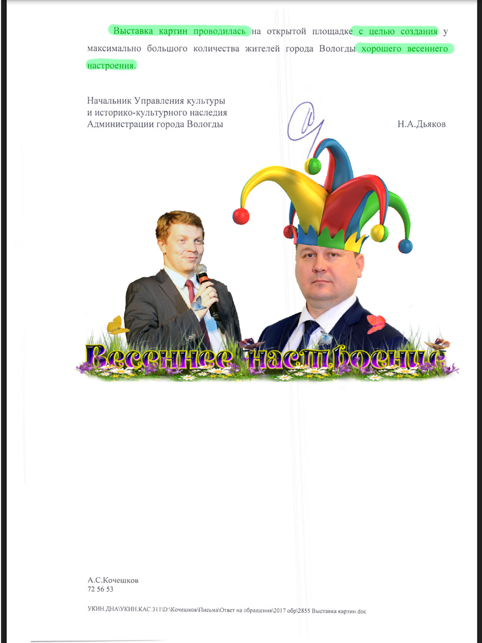 Вам еще не надоел сериал про борьбу вологодской администрации с кубами Навального? Если нет, то у нас продолжение. Очередной выход на арену катал Никитина и Дьякова, которые приготовили в своей шулерской колоде очередную крапленую карту. Что уже только не пробовал чекисто-чиновник Алексей Никитин, чтобы не разрешать нам провести агитационный пикет в центре города. И угрозу обрушения, и девочек из прошлого, и незаконные кафе. Теперь мы узнали, что еще и весеннее настроение было задействовано в борьбе с Алексеем Навальным.