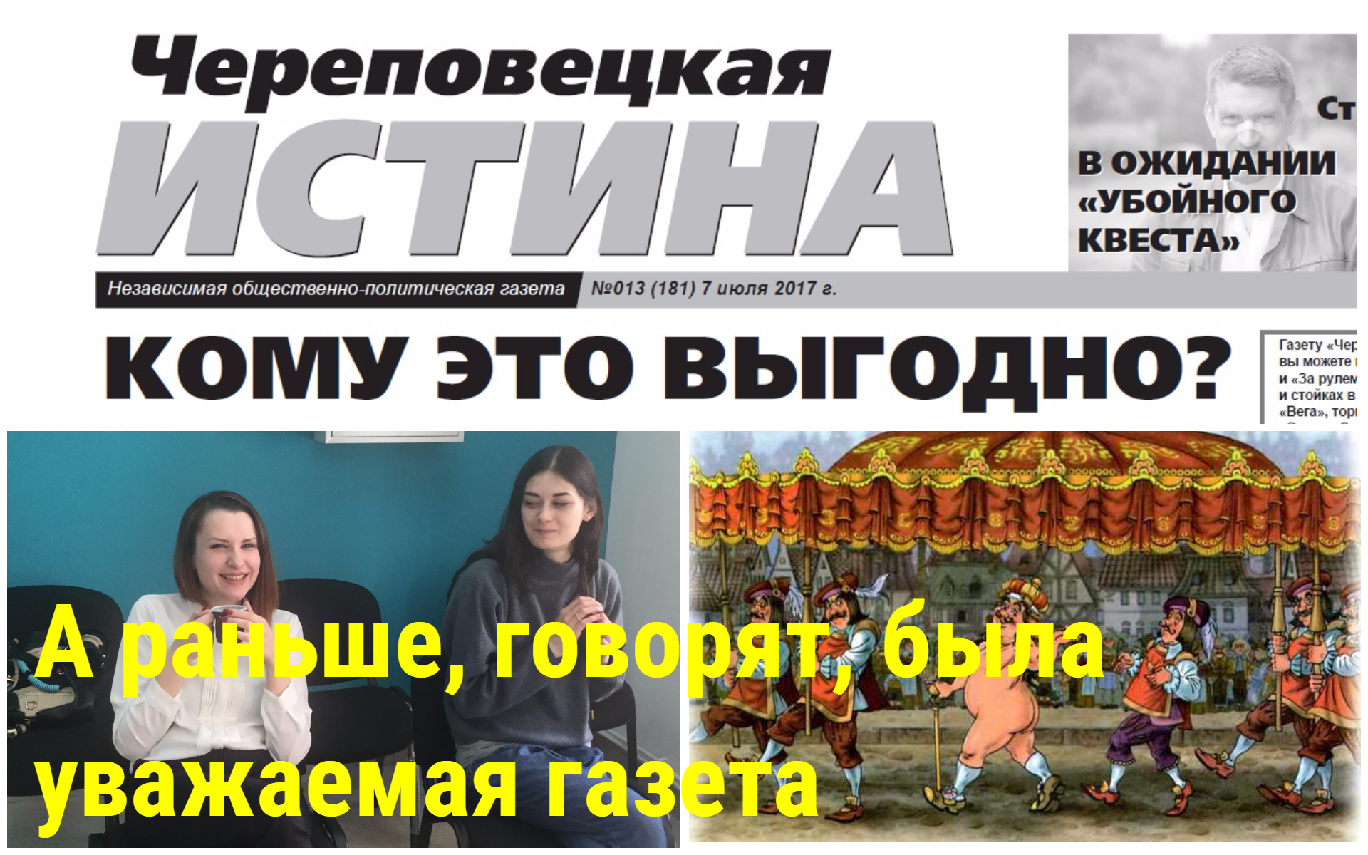 Была, когда то, в Череповце, как бы оппозиционная газета «Череповецкая «истина». Рассказывают, что даже печатала резкие материалы и расследования о власть имущих. Сейчас же, на самом деле уже давно, стала одним из столпов желтизны череповецкой прессы. Но, авторитет то еще остался и в глазах части населения выглядит приличной.