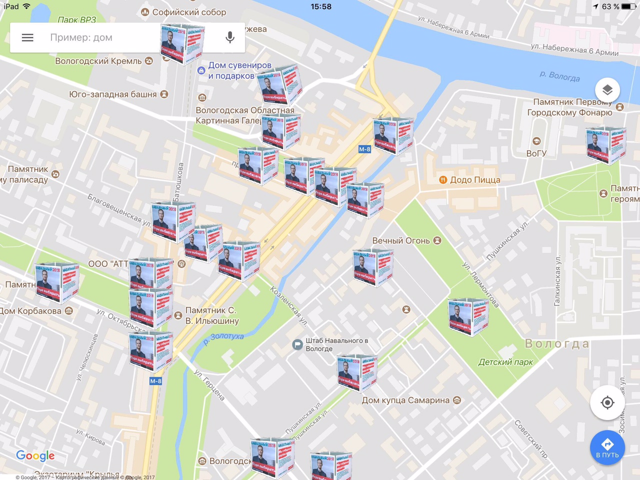 Во всех запрещенных местах не найдено следов альтернативных мероприятий или причин мешающих разместить кубы с информацией о кандидате в Президенты Алексее Навальном.