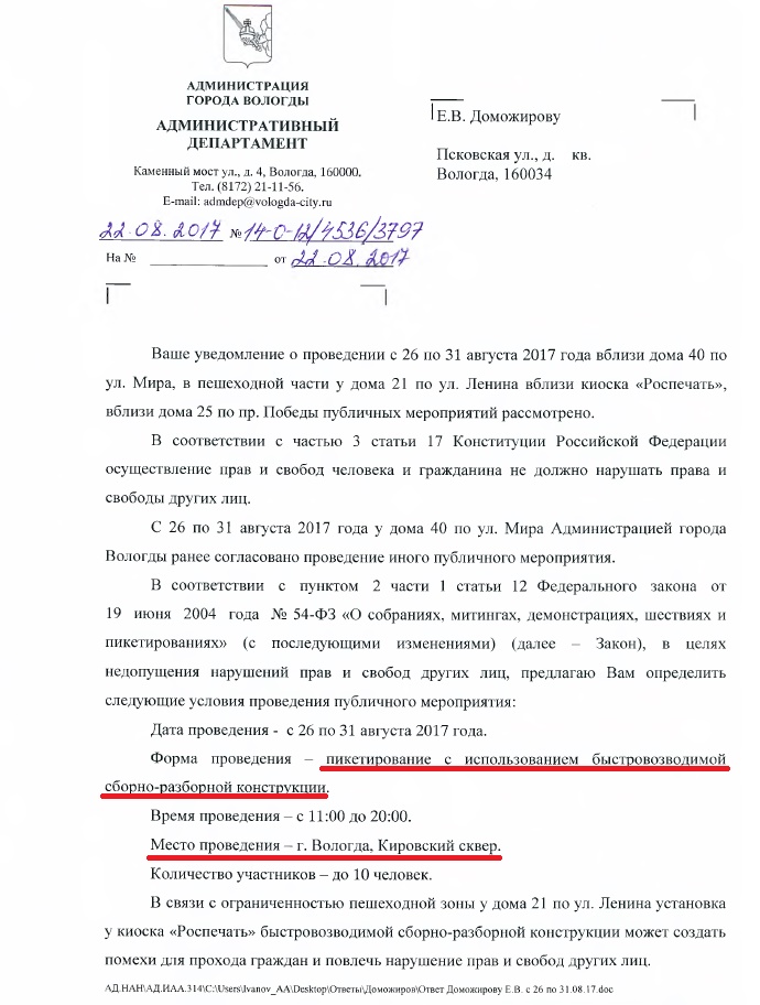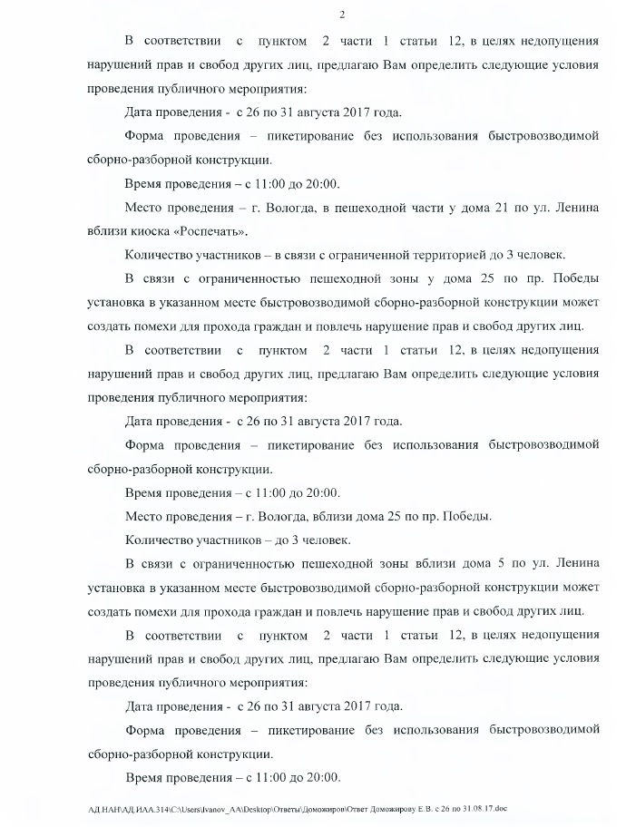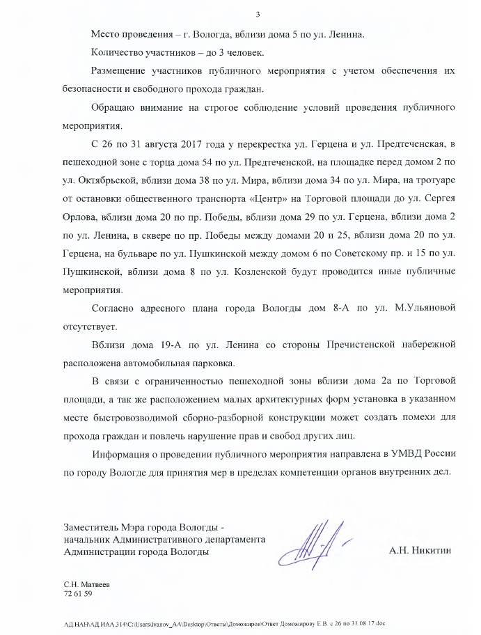 История с запретом кубов #Навальный2018 в Вологде продолжается. Вчера я рассказал вам о новой заявке и отсутствии на заявленных местах иных публичных мероприятий. И вот, мы получили очередной ответ. Как думаете, сколько в итоге мест из новых предложенных 20-ти нам согласовали?