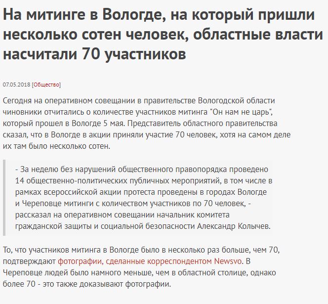 5 мая Вологда присоединилась к общероссийской акции протеста «За право быть гражданином» или #ОнНамНеЦарь. На согласованный митинг, прошедший на площади Чайковского, вышло порядка 400-500 человек.