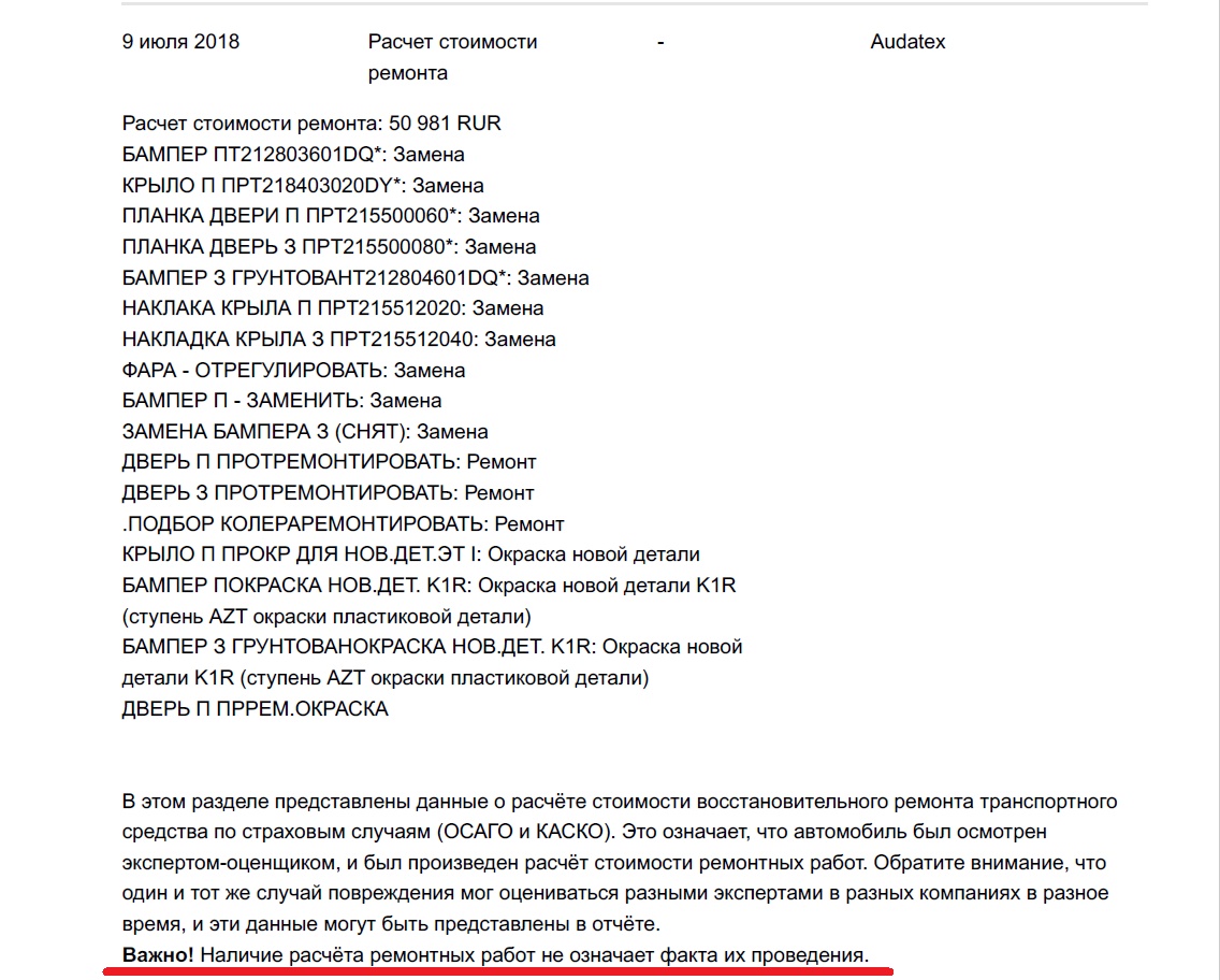 Причём в отчёте расписаны и повреждения авто и расчёт стоимости ремонта.
