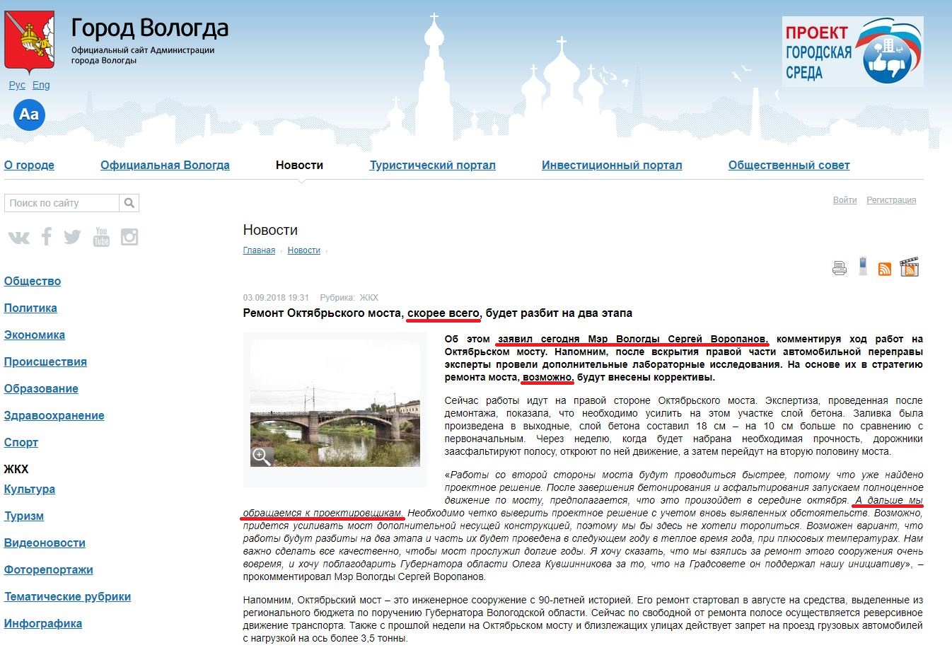 На днях наш славный губернатор заявил, обращаясь к главам районов на оперативном совещании, — Работать вы, коллеги, отвыкли напрочь. И тут, смотря только лишь на ремонт Октябрьского моста в Вологде, с Олегом Кувшинниковым нельзя не согласиться.