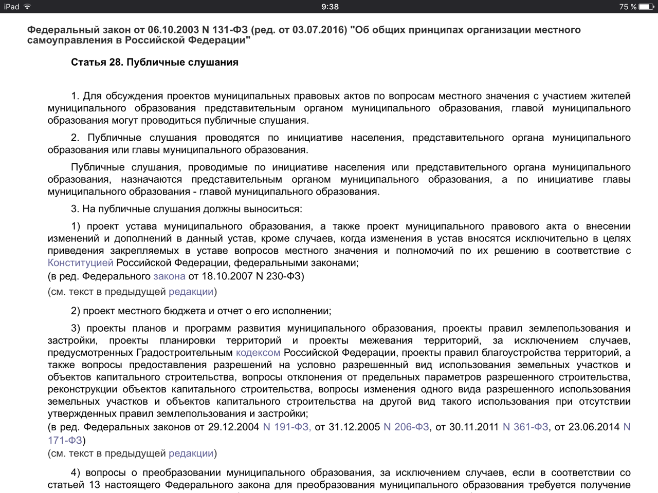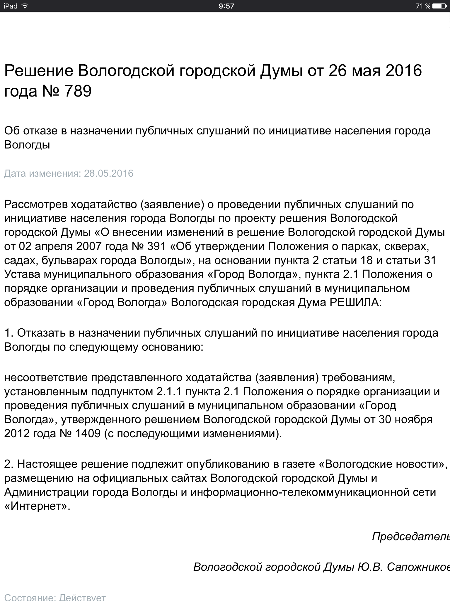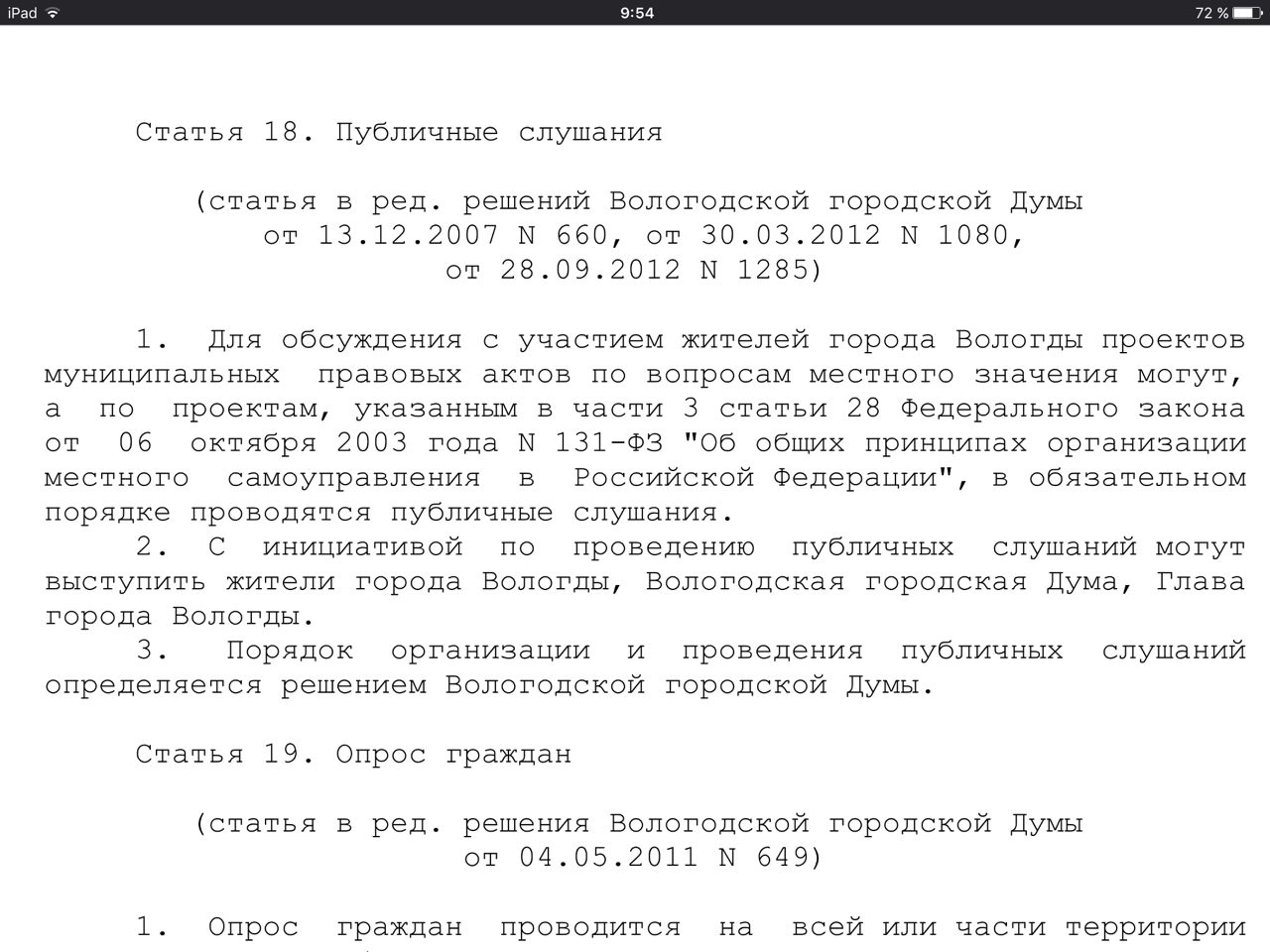 Докладчик Зуев был в ударе, сыпал нормами законов и ссылался на пункты статей. Якобы из-за 28 ст. 131 ФЗ и 18 ст. Устава города слушания нельзя провести.