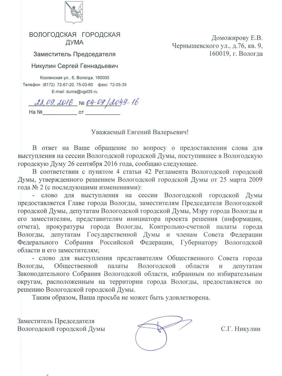 На 19-й сессии Вологодской городской Думы, прошедшей 29 сентября, гражданам Вологды в очередной раз было отказано в инициативе проведения публичных слушаний по вопросу внесения изменений в перечень парков, садов, скверов и бульваров.